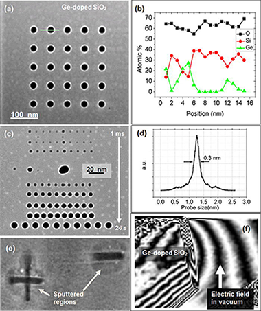A focused electron beam in a scanning transmission electron microscope (STEM) is used to create arrays of core-shell structures in a specimen of amorphous SiO2 doped with Ge. The same electron microscope is then used to measure the changes that occurred in the specimen in three dimensions using electron tomography. The results show that transformations in insulators that have been subjected to intense irradiation using charged particles can be studied directly in three dimensions. The fabricated structures include core-shell nano-columns, sputtered regions, voids, and clusters.