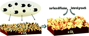 The study of the growth mechanisms of amorphous hydrogenated carbon coatings (a-CH x) deposited by reactive pulsed magnetron discharge in Ar + C 2H 2, Ar + H 2, and Ar + C 2H 2 + H 2 low-pressure atmospheres is presented in this work. Hydrogen-containing species of the reactant gas affect the microstructure and surface properties of the a-CH x thin films. The dynamic scaling theory has been used to relate the main reactive species involved in the deposition process to the growth mechanisms of the thin film by means of the analysis of the roughness evolution. Anomalous scaling effects have been observed in smooth a-CH x coatings. Dynamic scaling exponents α, β, and z indicate a general growth controlled by surface diffusion mechanisms. Hydrogen species have an influence on the lateral growth of the a-CH x coatings and are involved in the development of a polymeric-like structure. Meanwhile, hydrocarbon species promote the generation of higher aggregates, which increases the roughness of a more sp 2 clustering structure of the a-CH x coating.