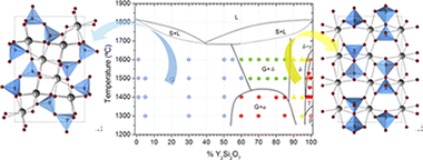High resolution synchrotron powder XRD, 89Y CPMG NMR, and 139La MAS NMR spectroscopy have been applied to eventually draw the phase diagram of the La2Si2O7–Y2Si2O7 system. The diagram presents a solid solubility region of G-(La,Y)2Si2O7, which extends to the La0.9Y1.1Si2O7 composition at any temperature of this study. Compositions richer in Y show two-phase domains, with G + α at T < 1450 °C and G + δ at T > 1450 °C. The Y-rich extreme is more complex, showing two solid solution regions of δ- and γ-(La,Y)2Si2O7 polymorphs which appear with increasing Y content, respectively. It is interesting to note that the La for Y substitution mechanism in the G-(La,Y)2Si2O7 polymorph is not homogeneous, but a preferential occupation of Y for the RE2 site is observed. Finally, the 89Y and 139La isotropic chemical shift values in G-(La,Y)2Si2O7 have been described here for the first time and assigned to the different RE crystallographic sites of the unit cell.