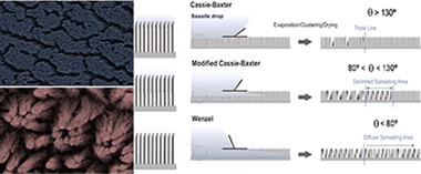 This article aims toward a full description of the wetting conversion from superhydrophobicity to superhydrophilicity under illumination with UV light of high-density ZnO nanorods surfaces by (i) following the evolution of the clusters and superstructures formed by the nanocarpet effect as a function of the water contact angle (WCA); (ii) characterization of the superhydrophobic and superhydrophilic states with an environmental scanning electron microscope (ESEM); and (iii) using the nanocarpet effect as a footprint of both local and apparent water contact angles. Thus, the main objective of the article is to provide a general vision of the wettability of 1D photoactive surfaces. In parallel, the nanocarpet (NC) formation by clustering of vertically aligned ZnO nanorods (NR) when water is dripped on their surface and then dried is studied for the first time by taking advantage of the possibility of tuning the surface water contact angle of the ZnO NR structure under UV preillumination. As a result, we demonstrate the feasibility of controlling the size and other morphological characteristics of the NCs. Moreover, a strong anisotropic wetting behavior, characterized by a Δθ = θ – θ = 30°, is shown on an asymmetrically aligned NC surface resulting from arrays of tilted NRs. The study of the condensation/evaporation of water on/from an as-prepared (superhydrophobic) or a preilluminated (superhydrophilic) NR surface examined by an environmental scanning electron microscope has evidenced the formation of supported water droplets with polygonal shapes in the first case and the complete filling of the inter-NR space in the latter. The long-term stability of the NC clusters has been utilized as a footprint to track the penetration depth of water within the inter-NR space in the three borderline regions of water droplets. This analysis has shown that for moderately hydrophobic surfaces (i.e., water contact angles lower than 130°) water droplets do not present a well-defined borderline trace but a spreading region where water penetrates differently with the NR interspace. The transition from a Cassie–Baxter to a modified Cassie–Baxter to finish in a Wenzel wetting state is found on these surfaces depending on the UV preillumination time and is explained with a model where water interaction with the NR units is the critical factor determining the macroscopic wetting behavior of these surfaces.