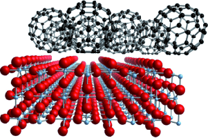 The adsorption of C60, a typical acceptor organic molecule, on a TiO2 (110) surface has been investigated by a multitechnique combination, including van der Waals density functional calculations. It is shown that the adsorbed molecules form a weakly interacting molecular layer, which sits on the fivefold-coordinated Ti that is confined between the prominent bridging oxygen rows (see figure).