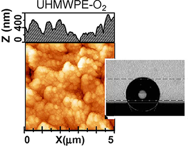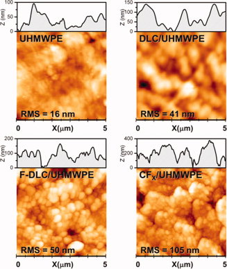 Development of intrinsically antibacterial surfaces is of key importance in the context of prostheses used in orthopedic surgery. This work presents a thorough study of several plasma-based coatings that may be used with this functionality: diamond-like carbon (DLC), fluorine-doped DLC (F-DLC), and a high-fluorine-content-carbon-fluor polymer (CFX). The coatings were obtained by a radio-frequency plasma-assisted deposition on ultra high molecular weight polyethylene (UHMWPE) samples and physicochemical properties of the coated surfaces were correlated with their antibacterial performance against collection and clinical Staphylococcus aureus and Staphylococcus epidermidis strains. The fluorine content and the relative amount of CC and CF bonds were controlled by X-ray photoelectron spectroscopy, and hydrophobicity and surface tension by contact angle measurements. Surface roughness was studied by Atomic Force Microscopy. Additional nanoidentation studies were performed for DLC and F-DLC coatings. Unpaired t test and regression linear models evaluated the adherence of S. aureus and S. epidermidis on raw and coated UHMWPE samples. Comparing with UHMWPE, DLC/UHMWPE was the least adherent surface with independence of the bacterial species, finding significant reductions (p ≤ 0.001) for nine staphylococci strains. Bacterial adherence was also significantly reduced in F-DLC/ UHMWPE and CFx/UHMWPE for six strains. © 2012 Wiley Periodicals, Inc. J Biomed Mater Res Part A 100A:2813–2820, 2012.