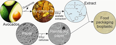 Reinforced films were fabricated by impregnating paper in ethyl cellulose solutions. After solvent evaporation, the infused ethyl cellulose acted as binder of the paper microfibres and occupied the pores and cavities, thus improving the mechanical and barrier properties. To prepare active films, avocado by-products from guacamole industrial production were extracted in ethyl acetate. Then, the extract (optimized to be rich in phenolic compounds and flavonoids and mainly composed by lipids) was incorporated to the paper reinforced with the highest content of ethyl cellulose. In general, the addition of the avocado by-products extract decreased the water uptake and permeability, improved the wettability, and increased the biodegradability in seawater and the antioxidant capacity. In addition, these films acted as barriers and retainers for Escherichia coli and Bacillus cereus. The potentiality of these materials for food packaging was demonstrated by low overall migrations and a similar food preservation to common low-density polyethylene.