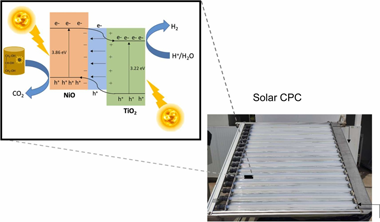 To improve TiO2 for H2 generation, one strategy for the separation of photogenerated charges is the formation of heterostructures with other materials. In particular, NiO is a photocatalyst known for its good stability and low cost. However, no studies at pilot scale using solar energy have been described. Consequently, an evaluation of a physical NiO:TiO2 mixture at pilot scale (25 L) with natural irradiation (2.10 m2 of sun-exposed surface) and with simultaneous glycerol photoreforming was explored. NiO:TiO2 50 mg & sdot;L- 1 resulted in the highest hydrogen production, showing an STH = 1.44%, considering only the UV fraction of the solar irradiation. H2 and CO2 production were analysed by on-line GC; Glycerol, dissolved organic carbon, carboxylic acids and nickel leaching were also evaluated. The NiO:TiO2 mixtures rendered a systematically lower H2 production in natural water than in high-purity water. The increase of ionic strength increased the mean size of particle clusters, promoting rapid sedimentation. All this indicates the importance of testing under real field conditions for attaining reliable solar to hydrogen (STH) efficiency.