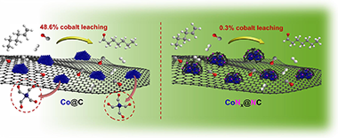 The ultimate target in heterogeneous catalysis is the achievement of robust, resilient and highly efficient materials capable of resisting industrial reaction conditions. Pursuing that goal in liquid -phase hydroformylation poses a unique challenge due to carbon monoxide -induced metal carbonyl species formation, which is directly related to the formation of active homogeneous catalysts by metal leaching. Herein, supported heteroatomincorporated (P and N) Co nanoparticles were developed to enhance the resistance compared with bare Co nanoparticles. The samples underwent characterization using operando XPS, XAS and HR electron microscopy. Overall, P- and N -doped catalysts increased reusability and suppressed leaching. Among the studied catalysts, the one with N as a dopant, CoNx@NC, presents excellent catalytic results for a Co -based catalyst, with a 94% conversion and a selectivity to aldehydes of 80% in only 7.5 h. Even under milder conditions, this catalyst outperformed existing benchmarks in Turnover Numbers (TON) and productivity. In addition, computational simulations provided atomistic insights, shedding light on the remarkable resistance of small Co clusters interacting with N -doped carbon patches.