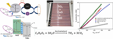 Glycerol is a by-product in biodiesel production (in the range of g·L−1), so its photoreforming by photocatalysis is a way of valorising it. TiO2 in photocatalysis has been widely studied, although its efficiency is limited by the high energy band gap, and the electron-hole recombination. Its combination with different semiconductors should improve charge separation, extending also the absorption from UV to visible light. Cu and Ni oxides are two of the most efficient low-cost transition metal oxide catalysts. Experiments were carried out in a 25 L pilot plant connected to a compound parabolic solar collector. Different combinations of the three semiconductors, based on the concentration of each metal on TiO2 (Me, 5%, 7.2% and 10%) were evaluated. Evonik P25-TiO2, CuO and NiO were combined by mechanical mixing. Hydrogen was quantified by a micro gas chromatograph, and copper and nickel leaching by ICP-MS. The best hydrogen production (0.060 mMol kJ−1) was attained with a proportion of 10:1 of TiO2:MeO, that corresponds to a total metal concentration of 7.2 wt%, being Cu and Ni in the same proportion. Metal content in solution increased as the reaction progressed, but Ni lixiviation of <0.012 mg L−1 was not significant. Significant Cu leaching (>1 mg L−1) was observed. This article presents novel results, in a solar pilot plant, for determining which ternary mixture can give better results, as well as metal leaching into water. Handling relevant volume of water in anoxic conditions can help to understand the application of this technology for the production of hydrogen.