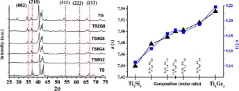The complete range of Ti5Si3–Ti5Ge3 solid solutions was synthesised from elemental mixtures of Ti, Si, and Ge under an inert atmosphere via mechanically induced self-sustaining reactions (MSR). The stoichiometry of Ti5Si3−xGex solid solutions was controlled by adjusting the Si/Ge ratio of the initial mixture. The chemical composition and lattice parameters of the materials confirmed that Ti5Si3–Ti5Ge3 solid solutions with good chemical homogeneity could be produced via MSR.