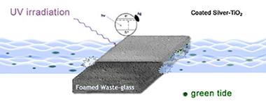 Silver-TiO2 nanocomposite was prepared by photodeposition of silver nanoparticles on the surface of titanium dioxide. The sonochemical method was used for the deposition of silver-TiO2 powder on commercial foamed waste-glass strips (FWGS). The silver-TiO2 and the coated FWGS was characterized by XRD, DRS, SEM, TEM and nitrogen adsorption. In order to enhance silver-TiO2 deposition, different parameters were evaluated such as the solvent effect and use of stabilizing agents. The best deposition was obtained with an aqueous solution of polyvinyl alcohol (PVA) and an ultrasound irradiation source of 23.3 kHz. The photocatalytic activity of the silver-TiO2 coated FWGS was evaluated in the UV photo-assisted destruction of the noxious microalgae, Tetraselmis suecica. It was found that after the photocatalytic irradiation, for 180 min, the algae cells were deformed, fragmented and annihilated, thereby avoiding its regeneration.2