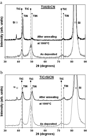 The aim of this work was a comparative investigation of the structure and properties of Al- and Cr-doped TiSiCN coatings deposited by magnetron sputtering of composite TiAlSiCN and TiCrSiCN targets produced by self-propagating high-temperature synthesis method. Based on X-ray diffraction, scanning and transmission electron microscopy, X-ray photoelectron spectroscopy, and Raman spectroscopy data, the Al- and Cr-doped TiSiCN coatings possessed nanocomposite structures (Ti,Al)(C,N)/a-(Si,C) and (Ti,Cr)(C,N)/a-SiCxNy/a-C with cubic crystallites embedded in an amorphous matrix. To evaluate the thermal stability and oxidation resistance, the coatings were annealed either in vacuum at 1000, 1100, 1200, and 1300°C or in air at 1000°C for 1h. The results obtained show that the hardness of the Al-doped TiSiCN coatings increased from 41 to 46GPa, reaching maximum at 1000°C, and then slightly decreased to 38GPa at 1300°C. The Cr-doped TiSiCN coatings demonstrated high thermal stability up to 1100°C with hardness above 34GPa. Although both Al- and Cr-doped TiSiCN coatings possessed improved oxidation resistance up to 1000°C, the TiAlSiCN coatings were more oxidation resistant than their TiCrSiCN counterparts. The TiCrSiCN coatings showed better tribological characteristics both at 25 and 700°C and superior cutting performance compared with the TiAlSiCN coatings.