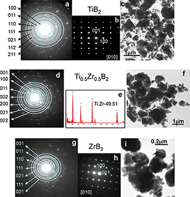 Solid solutions of TiB2-ZrB2 and TiB 2-HfB2 were obtained under an inert atmosphere by high-energy ball-milling mixtures of Ti/Zr/B and Ti/Hf/B, respectively. Milling promoted mechanically induced self-sustaining reactions (MSR), and the ignition time was dependent on the initial composition of the mixture. The stoichiometry of Ti1-xZrxB2 and Ti1-xHf xB2 solid solutions was controlled by adjusting the atomic ratio of the reactants. The solid solutions were characterised by X-ray diffraction, transmission electron microscopy, electron diffraction, and energy dispersive X-ray spectroscopy. The results revealed that TiB2- ZrB2 possessed a nanometric microstructure and good chemical homogeneity. However, in the TiB2-HfB2 system, an inhomogeneous solid solution was obtained when a Ti-rich mixture was employed. The solid solutions showed good thermal stability; thus, can be used as raw materials for the development of technological materials for structural applications.
