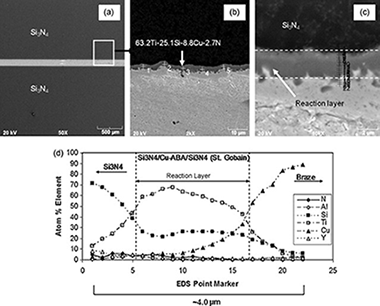 Self-joining of St. Gobain Si3N4 (NT-154) using a ductile Cu–Al–Si–Ti active braze (Cu-ABA) was demonstrated. A reaction zone (∼2.5–3.5 μm thick) developed at the interface after 30 min brazing at 1317 K. The interface was enriched in Ti and Si. The room temperature compressive shear strengths of Si3N4/Si3N4 and Inconel/Inconel joints (the latter created to access baseline data for use with the proposed Si3N4/Inconel joints) were 140 ± 49 MPa and 207 ± 12 MPa, respectively. High-temperature shear tests were performed at 1023 K and 1073 K, and the strength of the Si3N4/Si3N4 and Inconel/Inconel joints were determined. The joints were metallurgically well-bonded for temperatures above 2/3 of the braze solidus. Scanning and transmission electron microscopy studies revealed a fine grain microstructure in the reaction layer, and large grains in the inner part of the joint with interfaces being crack-free. The observed formation of Ti5Si3 and AlN at the joint interface during brazing is discussed.