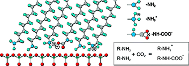 Structural and chemical data on n-octadecylamine self-assembled monolayers on mica (ODA/mica SAMs) have been obtained from ATR-FTIR and XPS spectroscopies. The analysis of the methylene modes concludes that alkylamine molecules are arranged in a rigid and well-ordered packing. Besides, the magnitude of the splitting of the methylene scissoring deflection is consistent with a molecular tilted configuration within the self-assembled layer, as already reported from topographic AFM data. Molecular dynamics simulations have supported this conclusion. XPS has revealed the presence of an important fraction of protonated amino groups (-NH3+) even in freshly prepared ODA/mica SAMs in air at RT. Two sources of protonation are proposed: (i) the acid-base reaction of (-NH2) end groups with the water adlayer on the surface of hydrophilic mica and (ii) the formation of an alkylamonium alkylcarbamate by a fast reaction with the atmospheric CO2 dissolved in such water adlayer. Though the water induced amino protonation is hypothetical, the presence of carbamate is univocally confirmed by ATR-FTIR. Upon extended contact with air (ripening) the conformational ordering in ODA/mica SAMs is slightly improved. Besides, further amino group protonation takes place with no additional carbamate formation. The process is described by a tentative mechanism in which protons are transferred from water molecules at the edges of SAMs islands to the inside. On the other side, carbamation is hindered by the steric effect of CO2 molecules trying to penetrate the close packed structure of octadecylamine molecules.