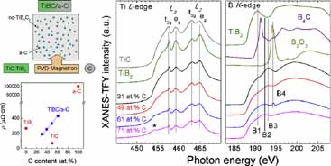 The local structure of TiBC and amorphous carbon (a-C) nanocomposite films (TiBC/a-C) was correlated with their optical and electrical properties. TiBC/a-C films with increasing C content were deposited by magnetron co-sputtering from TiC:TiB2 (60:40) and graphite targets. Chemical composition is determined by electron energy-loss spectroscopy. Grazing incidence X-ray diffraction reveals that the microstructure of the films is amorphous with small nanocrystallites emerging by increasing the C content that could be attributed to the formation of ternary (TiBxCy) or mixed binary (TiB2 and TiC) phases. Further information was then obtained by studying the chemical bonding by measuring the near-edge fine structure (NES) by electron energy-loss (B K-, C K-, and Ti L-edges) and X-ray absorption (B K- and Ti L-edges) spectroscopies. The NES analysis indicates the formation of a nanocrystalline ternary TiBxCy compound concomitant with the segregation of an a-C phase as the carbon content is increased. The optical properties were studied by spectroscopic ellipsometry and the electrical resistivity was measured by the Van der Pauw method between 20 and 300 K. The films continuously lose their metallic character in terms of optical constants and resistivity with increasing carbon content. Theoretical fitting of the electrical properties using the grain-boundary scattering model supported the formation of a nanocomposite structure based on a ternary TiBxCy phase embedded in a matrix of a-C. The electron transport properties are mainly limited by the high density of point defects, grain size, and transmission probability.
