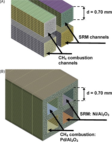 The integration of the steam reforming and combustion of methane in a catalytic microchannel reactor has been simulated by computational fluid dynamics (CFD). Two models including 4 or 20 square microchannels of 20 mm of length and 0.7 mm of side have been developed. It has been assumed that a thin and homogeneous layer of an appropriate catalyst has been uniformly deposited onto the channels walls. The kinetics of the steam reforming of methane (SRM), water-gas shift (WGS) and methane combustion in air have been incorporated into the models. This has allowed simulating the effect of the gas streams space velocities, catalyst load, steam-to-carbon (S/C) ratio and flow arrangement on the microreformer performance. The results obtained illustrate the potential of microreactors for process intensification: complete combustion of methane is achieved at gas hourly space velocities (GHSV) as high as 130,000 h−1. As concerns the SRM, methane conversions above 97% can be obtained at high GHSV of 30,000 h−1 and temperatures of 900–950 °C. Under these conditions selectivity for syngas is controlled by the WGS equilibrium.