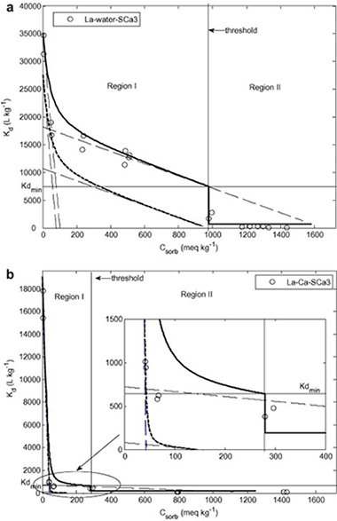 The sorption reversibility of La and Lu (considered as actinide analogues) onto a set of smectites (bentonite FEBEX; hectorite, HEC; MX80; saponite, SAP; Otay montmorillonite, SCa-3; and Texas montmorillonite, STx-1) was studied to estimate actinide retention by smectites that are candidates for use as engineered barriers in deep geological repositories. The sorption distribution coefficients (K d) and the reversibility parameters (desorption distribution coefficients (K d,des), adjusted distribution coefficients (K d,adj), and desorption rates (R des)) were determined from batch tests in two ionic media: deionized water and Ca 0.02 mol L -1. The latter simulates possible conditions due to the presence of concrete leachates. The results varied greatly depending on the ionic medium, the lanthanide concentration and the clay structure. The high values of K d,des obtained (up to 1.1 × 10 5 and 9.2 × 10 4 L kg -1 for La and Lu in water, and 2.8 × 10 4 and 4.1 × 10 4 L kg -1 for La and Lu in the Ca medium) indicate the suitability of the tested smectites for lanthanide (and therefore, actinide) retention. Based on all the data, SCa-3, HEC and FEBEX clays are considered the best choices for water environments, whereas in Ca environments the suitable clays depended on the lanthanide considered.