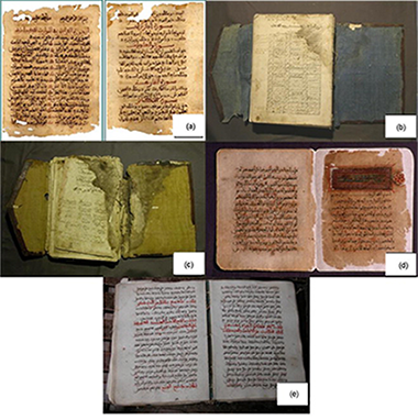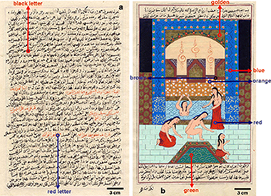 Illuminated Arabic manuscripts have been studied, employing two laboratory-made X-ray diffraction (XRD) systems developed recently in the C2RMF laboratory. The validity of the µ-XRD and XRD portable systems for the study of this type of artworks has been demonstrated. A common observation in all the analyses is the presence of calcite and rutile; also, hematite, goethite, cinnabar, brass, anatase and barite were detected in the various colours. Differences between the results obtained by both techniques due to acquisition mode are discussed. In addition, other techniques such as X-ray fluorescence (XRF) and micro-Raman were used for the complete characterization of the manuscripts.