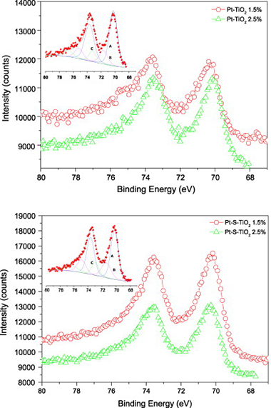 Platinum doped TiO2 materials were studied for the gas phase photocatalytic degradation of toluene. Platinum deposition was achieved by photodeposition method over TiO2 prepared by means of a sol-gel route. The effect of sulphuric acid pretreatment on the further platinisation process has been extensively studied. From the wide structural and surface analysis of the catalysts an interesting synergetic effect has been demonstrated. The previous sulphate treatment over TiO2 leads to improved dispersion of the Pt which presents a lower aggregation and homogeneous cluster size. This fact, together with the adequate control of anatase structural and surface parameter due to the sulphate treatment, renders a good photocatalytic performance for toluene oxidation reaction. The highest reaction rates and CO2 selectivities have been obtained for Pt-S-TiO2 samples.