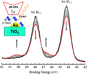 The interaction of O-2 with gold foil and gold nanoparticles grown by thermal deposition on TiO2(110) was studied by in situ ambient pressure X-ray photoelectron spectroscopy at room temperature. No spontaneous dissociation of O-2 was observed either on Au foil or oil Au nanoparticles up to 1 Torr of O-2. X-ray irradiation, however, is very effective in promoting gold oxidation on both surfaces in the presence of O-2. Our results help reconcile recent conflicting experimental observations regarding the activation of molecular oxygen, which is a crucial issue in Au catalyzed oxidation reactions.