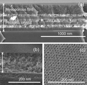 A synthetic route is presented to attain high-optical-quality multilayered structures that residtfront coupling ordered n7esoporous tilaniuni oxide thin films to the surface of a dense one-dimensional photonic crystal. Such architectures present spectrally well-defined photon resonant modes localized in the outer coating that finely respond to physicochemically induced modifications of its pore volume. The potential of these porous coatings in detection of environmental changes through variations of the photonic response of the ensemble is demonstrated by performing isothermal optical reflectance measurements under controlled vapor-pressure conditions.