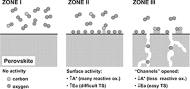 We have studied the oxidation of carbon monoxide over a lanthanum substituted perovskite (La0.5Sr0.5CoO3−d) catalyst prepared by spray pyrolysis. Under the assumption of a first-order kinetics mechanism for CO, it has been found that the activation energy barrier of the reaction changes from ∼80 to ∼40 kJ mol−1 at a threshold temperature of ca. 320 °C. In situ XPS near-ambient pressure (∼0.2 torr) shows that the gas phase oxygen concentration over the sample decreases sharply at ca. 300 °C. These two observations suggest that the oxidation of CO undergoes a change of mechanism at temperatures higher than 300 °C.