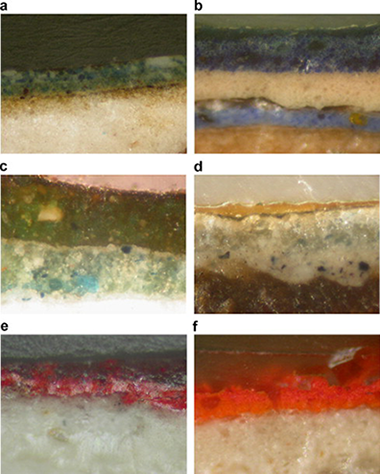 The samples have been prepared using the cross-section technique. This technique allows the examination of a large portion of a single paint layer in its original condition. A variety of pigments from samples belonging principally to the Cultural Heritage of Southern Spain were characterized by micro-Raman spectroscopy using visible excitation sources and micro-FTIR spectroscopy. The pigments studied comprise blue (azurite, ultramarine blue, Prussian blue), red (vermilion, haematite, red ochre, red lead, etc.), ochre and yellow (goethite, orpiment, realgar, etc.), green (malachite, copper resinate), and white (calcite, gypsum, white lead, titanium white, barite, lithopone) pigments, among others. An orientation is given for their appropriate and unequivocal characterization. Characterization by micro-FTIR and micro-Raman presents difficulties with some pigments. In these cases, analysis by EDX solves most of these doubts. The combined use of both spectroscopic techniques, together with SEM–EDX microanalysis, provides one of the most useful methods in the characterization (and possible dating) of materials used in Cultural Heritage.