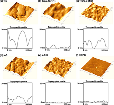 In this work some carbon-based coatings were studied by atomic force microscopy (AFM) and lateral force microscopy (LFM) techniques in order to evaluate their microstructure and friction properties at the micro and nanoscale. With this aim, four samples were prepared by magnetron sputtering: an amorphous carbon film (a–C), two nanocomposites TiC/a–C with different phase ratio (∼1:1 and ∼1:3) and a nanocrystalline TiC sample. Additionally, a highly oriented pyrolytic graphite (HOPG) and an amorphous hydrogenated carbon coating (a-C:H) were included to help in the evaluation of the influence of the roughness and the hydrogen presence respectively. The topography (roughness) of the samples was studied by AFM, whereas LFM was used to measure the friction properties at the nanoscale by two different approaches. Firstly, an evaluation of possible friction contrast on the samples was done. This task was performed by subtraction of forward and reverse images and lately confirmed by the study of lateral force profiles in both directions and the histograms of the subtraction images. Secondly, an estimation of the average friction coefficient over the analysed surface of each sample was carried out. To take into account the tip evolution/damaging, mica was used as a reference before and after each sample (hereafter called sandwich method), and samples-to-mica friction ratios were calculated. The LFM was shown to be a useful tool to characterise a mixture of phases with different friction coefficients. In general, the friction ratios seemed to be dominated by the amorphous carbon phase, as it was impossible to distinguish among samples with different proportions of the amorphous phase (friction ratios between 1.5 and 1.75). Nevertheless, it could be concluded that the differences in friction behaviour arose from the chemical aspects (nature of the phase and hydrogen content) rather than surface characteristics, since the roughness (Ra values up to 5.7 nm) does not follow the observed trend. Finally, the Ogletree method was employed in order to calibrate the lateral force and estimate the friction coefficient of our samples. A good agreement was found with macroscopic and literature values going from ∼0.3 for TiC to ∼0.1 for pure carbon.