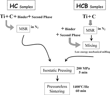 The properties of TiCxN1−x/(Ni or Co) cermets sintered by a pressureless method from powder mixtures, and obtained for the first time by a mechanically induced self-sustaining reaction process (MSR), were studied. The hardness, toughness, friction and wear coefficients, and oxidation resistance were determined. It was shown that cermets obtained from powdered materials synthesized in one single MSR step possessed improved mechanical properties, similar to those obtained in cermets with more complex bulk compositions. Higher wear resistances were observed in cermets whose hard phase was richer in carbon. The oxidation resistance of the cermets depended primarily on the binder composition. This resistance was better for those cermets with cobalt as the binder. Superior oxidation resistance was displayed when small amounts of W or Mo were incorporated into the binder.