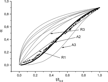It has been shown the ability of the Sample Controlled Reaction Temperature (SCRT) method for both discriminate the kinetic law and calculate the activation energy of the reaction. This thermal decomposition is best described by a Johnson–Mehl–Avrami kinetic model (with n = 2) with an activation energy of nuclei growth which fall in the range 52–59 kJ mol−1. The process is not a single-step because the initial rate of decomposition is likely to be limited by nucleation. The results reported here constitute the first attempt to use the new SCRT method to study the kinetic of the thermal decomposition of cobalt nitrate.