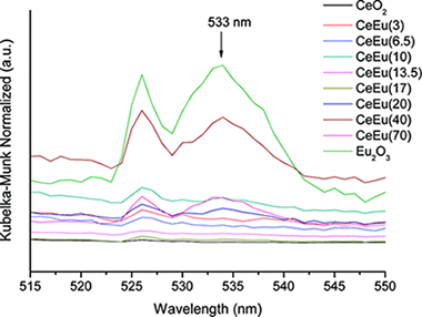 A series of Ce1−xEuxO2−x/2 mixed oxides was synthesized by coprecipitation. The solids were characterized by means of XRF, SBET, XRD, UV−vis, and Raman techniques, and their catalytic activities toward CO oxidation were tested. A solid solution, with CeO2 F-type structure, is formed for europium contents (measured as Eu2O3 by XRF) ≤20% wt. For higher contents, the solid solution is not formed, but a physical mixture is detected. The existence of oxygen vacancies in the solids with Eu2O3 contents between 3 and 17% wt was demonstrated by the presence of bands at 532 and 1275 cm−1 in their Raman spectra. The catalytic performances of the solids correlate with the amount of these punctual defects in the solid solution.