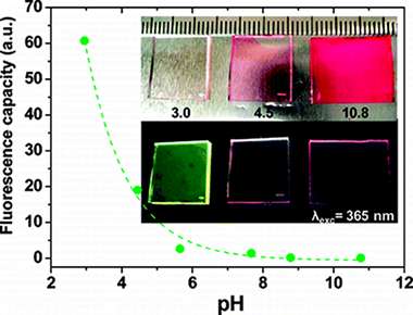 Rhodamine 6G (Rh6G) dye molecules have been incorporated into transparent and porous SiO2 thin films prepared by evaporation at glancing angles. The porosity of these films has been assessed by analyzing their water adsorption isotherms measured for the films deposited on a quartz crystal monitor. Composite Rh6G/SiO2 thin films were prepared by immersion of a SiO2 thin film into a solution of the dye at a given pH. It is found that the amount of Rh6G molecules incorporated into the film is directly dependent on the pH of the solution and can be accounted for by a model based on the point of zero charge (PZC) concepts originally developed for colloidal oxides. At low pHs, the dye molecules incorporate in the form of monomers, while dimers or higher aggregates are formed if the pH increases. Depending on the actual preparation and treatment conditions, they also exhibit high relative fluorescence efficiency. The thermal stability of the composite films has been also investigated by characterizing their optical behavior after heating in an Ar atmosphere at increasing temperatures up to 275 °C. Heating induces a progressive loss of active dye molecules, a change in their agglomeration state, and an increment in their relative fluorescence efficiency. The obtained Rh6G/SiO2 composite thin films did not disperse the light and therefore can be used for integration into optical and photonic devices.