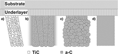 The performance of protective thin films is clearly influenced by their microstructure. The objective of this work is to study the influence of the structure of TiC/a-C nanocomposite coatings with a-C contents ranging from ~ 0% to 100% on their mechanical and tribological properties measured by ultramicroindentation and pin-on-disks tests at ambient air, respectively. The microstructure evolves from a polycrystalline columnar structure consisting of TiC crystals to an amorphous and dense TiC/a-C nanocomposite structure when the amount of a-C is increased. The former samples show high hardness, moderate friction and high wear rates, while the latter ones show a decrease in hardness but an improvement in tribological performance. No apparent direct correlation is found between hardness and wear rate, which is controlled by the friction coefficient. These results are compared to the literature and explained according to the different film microstructures and chemical bonding nature. The film stress has also been measured at the macro and micro levels by the curvature and Williamson–Hall methods respectively. Other mechanical properties of the coating such as resilience and toughness were evaluated by estimating the H3/E⁎2 and H/E⁎ ratios and the percentage of elastic work (We). None of these parameters showed a tendency that could explain the observed tribological results, indicating that for self-lubricant nanocomposite systems this correlation is not so simple and that the assembly of different factors must be taken into account.