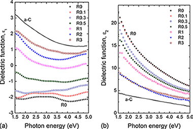 WC/amorphous carbon (a-C) thin films were deposited by dual magnetron sputtering from individual WC and graphite targets. The influence of film composition and microstructure on the optical and electrical properties was investigated. As evidenced by x-ray photoelectron spectroscopy and grazing angle x-ray diffraction measurements, the WC/a-C films are composite materials made of hexagonal W2C and/or cubic β-WC1−X nanocrystallites embedded in (a-C) matrix. The optical properties were studied by spectroscopic ellipsometry and the electrical resistivity was measured by the van der Pauw method between 20 and 300 K. Both the optical and the electrical properties of the WC/a-C films are correlated with the chemical composition and microstructure evolution caused by a-C addition. The optical properties of W2C/a-C and β-WC1−x/a-C films with a-C content ≤ 10 at. % are explained by modeling their dielectric functions by a set of Drude–Lorentz oscillators. Further increase in a-C content leads only to the formation of β-WC1−x/a-C nanocomposite structures and their optical properties progressively evolve to those of a-C single phase. The electrical resistivity as a function of the temperature of all the films exhibits a negative temperature coefficient of resistivity. Theoretical fitting using the grain-boundary scattering model shows that the transport properties are mainly limited by the grain size and electron mean free path parameters.