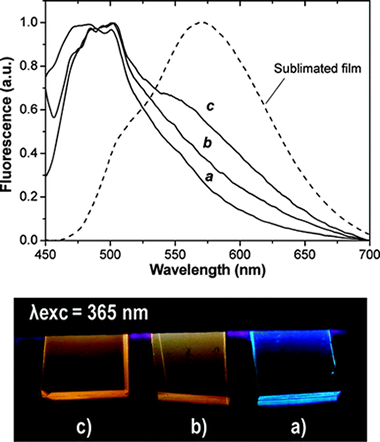 Mechanically stable and insoluble fluorescent thin films have been deposited by sublimating Rhodamine 6G laser dye in the downstream region of a low-power microwave ECR plasma using an experimental set-up designed to control the interaction of the dye molecule with the glow discharge. The use of reactive organosilane plasmas allows to control the dye distribution inside the matrix, leading to solid nanocomposite thin films containing non-aggregated dye molecules. The suppression of aggregates is a key issue to avoid fluorescence quenching. The obtained nanocomposite films are interesting because of their strong absorption and high fluorescence emission. In addition, they can be patterned using in situ plasma treatments in order to produce optically functional devices.