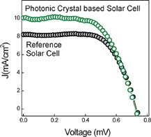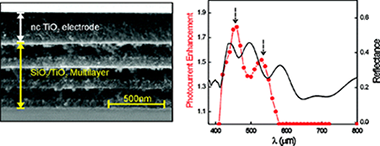 A device for solar-energy conversion was introduced in which a porous and highly reflecting 1D photonic crystal (1D PC) was coupled to a dye-sensitized nanocrystals anatase (NC-TiO2) electrode. The results show that the transparency of the PC-based dye-sensitized solar cells (DSSC) in the visible range of the electromagnetic spectrum is very similar to that of the reference cell. The multilayer whose photonic bandgap has a larger overlap with the absorption band of the ruthenium dye, gives rise to a larger enhancement of the photocurrent. It is also seen that the porous 0.5μm thick PC, whose deleterious effect is compensated by the large increment in photocurrent. The spectral photoelectric response of the cell clearly shows the effect that coupling to a PC has on the current photogenerated in the dye-sensitized electrode.