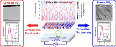 In this work, piezoelectric AWs and plasmas have been brought together during the growth of a thin film as a novel methodology of plasma-assisted thin film structuration. The ensuing effects have been investigated on a model system where SiO2 and SiOx (x<2) thin films have been deposited by magnetron sputtering at oblique angles (MS-OAD) on an electro-acoustically excited LiNbO3 piezoelectric substrate under resonant conditions. The microstructure of the resulting films was 2D patterned and depicted submillimeter size intermingled zones with different optical characteristics, compositions (SiO2 and SiOx) and porosity, from highly porous to dense and compact regions. The 2D nanostructural pattern mimics the AW distribution and has been accounted for by means of a specific simulation model. It is concluded that the morphological and chemical film pattern replicates the distribution of polarization potential on the surface of the AW activated substrate immersed in the plasma. Moreover, we show that the main mechanism responsible for the appearance of domains with different morphology and chemical composition is the focused impingement of Ar+plasma ions on certain regions of the substrate. The general character of this patterning process, the underlying physics and its possibilities to tailor the composition and microstructure of dielectric thin film materials are discussed.