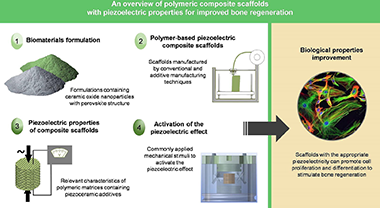 Despite the dramatic change that Tissue Engineering or stem cell therapies have brought to current therapeutic strategies, there is a lack of functionalities in the available biomaterials for manufacturing scaffolds to treat several highly prevalent osseous diseases (osteochondral defects, osteoporosis, etc.). One promising approach to fill this gap involves the development of innovative piezoelectric scaffolds for improved bone regeneration. Scaffolds with the appropriate piezoelectricity can positively influence the proliferation and differentiation of mesenchymal stem cells to regenerate bone tissue, since surface electrical charges play a key role in the mechanotransduction process. In this work, polymeric-based composite scaffolds with piezoelectric properties intended for bone tissue engineering are reviewed. Special attention is paid to biocompatible, piezoelectric polymers that show suitable properties to be pro-cessed by additive manufacturing techniques. Previous works on composite scaffolds based of these poly-meric matrices and containing piezoceramic additives are summarized. The use of piezoelectric nanostructured composite formulations containing lead-free ceramic oxide nanoparticles with per-ovskite structure is highlighted. Also, different commonly applied mechanical stimuli to activate the piezoelectric effect of the developed materials are presented. Finally, other applications of such scaffolds are mentioned, including their capabilities for real-time monitoring