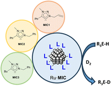 A series of ruthenium nanoparticles (Ru & BULL;MIC) stabilized with different mesoionic 1,2,3-triazolylidene (MIC) ligands were prepared by decomposition of the Ru(COD)(COT) (COD = 1,5-cyclooctadiene; COT = 1,3,5-cyclooctatriene) precursor with H-2 (3 bar) in the presence of substoichiometric amounts of the stabilizer (0.1-0.2 equiv.). Small and monodisperse nanoparticles exhibiting mean sizes between 1.1 and 1.2 nm were obtained, whose characterization was carried out by means of transmission electron microscopy (TEM), including high resolution TEM (HRTEM), inductively coupled plasma (ICP) analysis and X-ray photoelectron spectroscopy (XPS). In particular, XPS measurements confirmed the presence of MIC ligands on the surfaces of the nanoparticles. The Ru & BULL;MIC nanoparticles were used in the isotopic H/D exchange of different hydrosilanes, hydroboranes, hydrogermananes and hydrostannanes using deuterium gas under mild conditions (1.0 mol% Ru, 1 bar D-2, 55 & DEG;C). Selective labelling of the E-H (E = B, Si, Ge, Sn) bond in these derivatives, with high levels of deuterium incorporation, was observed.
