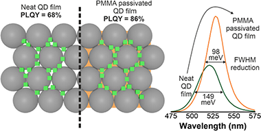 Achieving highly transparent and emissive films based on perovskite quantum dots (PQDs) is a challenging task since their photoluminescence quantum yield (PLQY) typically drops abruptly when they are used as building blocks to make a solid. In this work, we obtain highly transparent films containing FAPbBr(3) quantum dots that display a narrow green emission (lambda = 530 nm, full width at half-maximum (FWHM) = 23 nm) with a PLQY as high as 86%. The method employed makes use of porous matrices that act as arrays of nanoreactors to synthesize the targeted quantum dots within their void space, providing both a means to keep them dispersed and a protective environment. Further infiltration with poly(methyl methacrylate) (PMMA) increases the mechanical and chemical stability of the ensemble and serves to passivate surface defects, boosting the emission of the embedded PQD and significantly reducing the width of the emission peak, which fulfills the requirements established by the Commission Internationale de l'E ' clairage (CIE) to be considered an ultrapure green emitter. The versatility of this approach is demonstrated by fabricating a color-converting layer that can be easily transferred onto a light-emitting device surface to modify the spectral properties of the outgoing radiation.