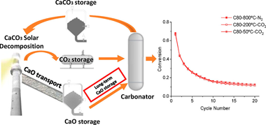 Long-term storage capability is often claimed as one of the distinct advantages of the calcium looping process as a potential thermochemical energy storage system for integration into solar power plants. However, the influence of storage conditions on the looping performance has seldom been evaluated experimentally. The storage conditions must be carefully considered as any potential carbonation at the CaO storage tank would reduce the energy released during the subsequent carbonation, thereby penalizing the round-trip efficiency. From lab-scale to conceptual process engineering, this work considers the effects of storing solids at low temperatures (50–200 °C) in a CO2 atmosphere or at high temperatures (800 °C) in N2. Experimental results show that carbonation at temperatures below 200 °C is limited; thus, the solids could be stored during long times even in CO2. It is also demonstrated at the lab scale that the multicycle performance is not substantially altered by storing the solids at low temperatures (under CO2) or high temperatures (N2 atmosphere). From an overall process perspective, keeping solids at high temperatures leads to easier heat integration, a better plant efficiency (+2–4%), and a significantly higher energy density (+40–62%) than considering low-temperature storage. The smooth difference in the overall plant efficiency with the temperature suggests a proper long-term energy storage performance if adequate energy integration is carried out.