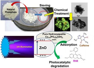 Zinc oxide-hydroxyapatite composites were prepared using wet impregnation method. Firstly, a natural phosphate ore rich in silica and calcium phosphate was sieved to separate silica phase from phosphate phase. Then, through a chemical precipitation method, a pure hydroxyapatite (HAP) was obtained, which was used as a support for ZnO immobilization and applied for the photodegradation of two toxic contaminants: a transparent molecule (caffeine) and dye molecule (rhodamine B). During the present work two weight ratio percentages of zinc oxide were used: 25 wt.% and 50 wt.% of ZnO relative to HAP. The samples were characterized by X-ray diffraction (XRD), Fourier Transform Infrared (FTIR), X-ray Fluorescence (XRF), BET surface area (SBET), Scanning Electron Microscopy (SEM-EDS) and by Transmission Electron Microscopy (TEM-STEM). The immobilization of ZnO on HAP surface followed by thermal treatment at 400 °C for 2 h to get a homogenous dispersion of ZnO on the hydroxyapatite support. At high ZnO impregnation percentage, photodegradation performances of ZnO-HAP under UV illumination were fast and superior than the ZnO photocatalyst alone. The results showed that due to the presence of HAP, the conversion of both molecules became faster and greater, since it promotes the synergic phenomena of adsorption and photocatalysis. The toxicity of the treated substrate solutions obtained in the corn kernels germination test indicated a low toxicity after the photodegradation processes, probably due to a high mineralization degree.