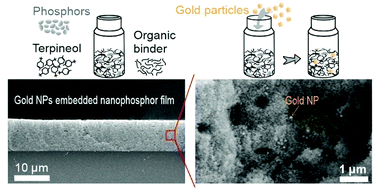 Owing to their unique non-linear optical character, lanthanide-based up-converting materials are potentially interesting for a wide variety of fields ranging from biomedicine to light harvesting. However, their poor luminescent efficiency challenges the development of technological applications. In this context, localized surface plasmon resonances (LSPRs) have been demonstrated as a valuable strategy to improve light conversion. Herein, we utilize LSPR induced by gold nanoparticles (NPs) to enhance up-conversion photoluminescence (UCPL) in transparent, i.e. scattering-free, films made of nanophosphors formed by fluoride–oxyfluoride host matrix that feature high thermal stability. Transparency allows excitation by an external source without extinction losses caused by unwanted diffuse reflection. We provide a simple method to embed gold NPs in films made of YF/YOF:Yb3+,Er3+ UC nanophosphors, via preparation of a viscous paste composed of both UC nanophosphors and colloidal gold NPs, reducing complexity in sample fabrication. The dimensions of gold NPs are such that their associated LSPR matches spectrally with the green emission band of the Er3+ doped nanophosphors. In order to demonstrate the benefits of plasmonic nanoparticles for UCPL in nanophosphor films, we provide a careful analysis of the structural properties of the composite thin films along with precise characterization of the impact of the gold NPs on the photophysical properties of UC nanophosphors.
